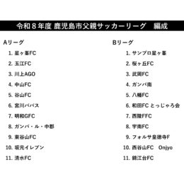 令和8年度父親サッカーリーグは以下の編成により、日程表のとおり開催いたします。なお、日程は天候等により変更となる場合があります。各チーム責任者の方は登録名簿の準備をお願いいたします。今季もケガのないよう楽しみましょう。1…