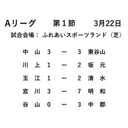 A、Bリーグの共催となります。 日時:令和8年3月22日 会場:ふれあいスポーツランド(芝) Aリーグ:G管 中山FC、休み 星ヶ峯FC Bリーグ:G管 ガンバ南、休み S星ヶ峯