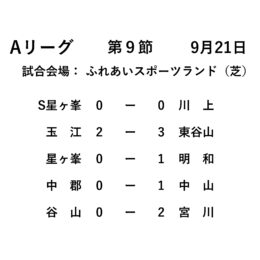 日時:令和7年9月21日 会場:ふれあいスポーツランド(芝) Aリーグ:G管 S星ヶ峯、休み 坂元イレブン Bリーグ:G管 西谷山FC、休み 西陵FFC