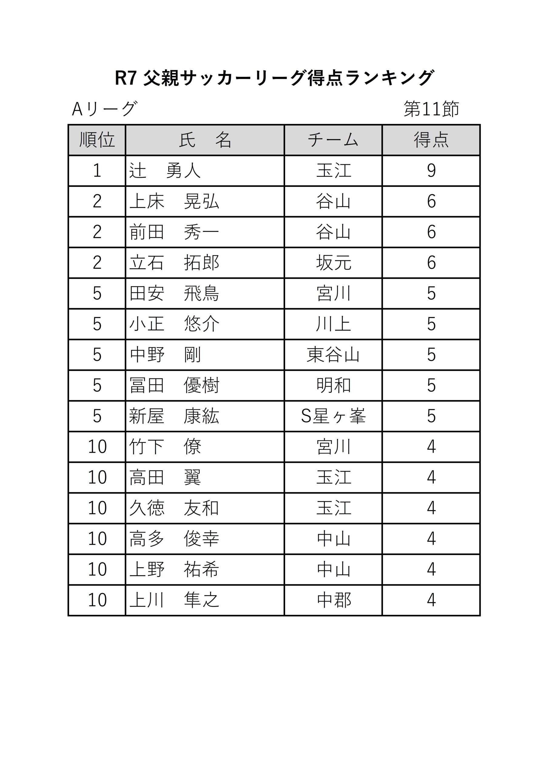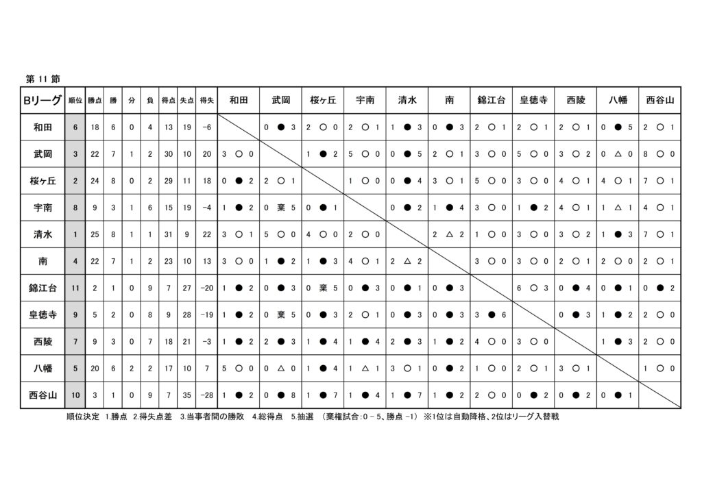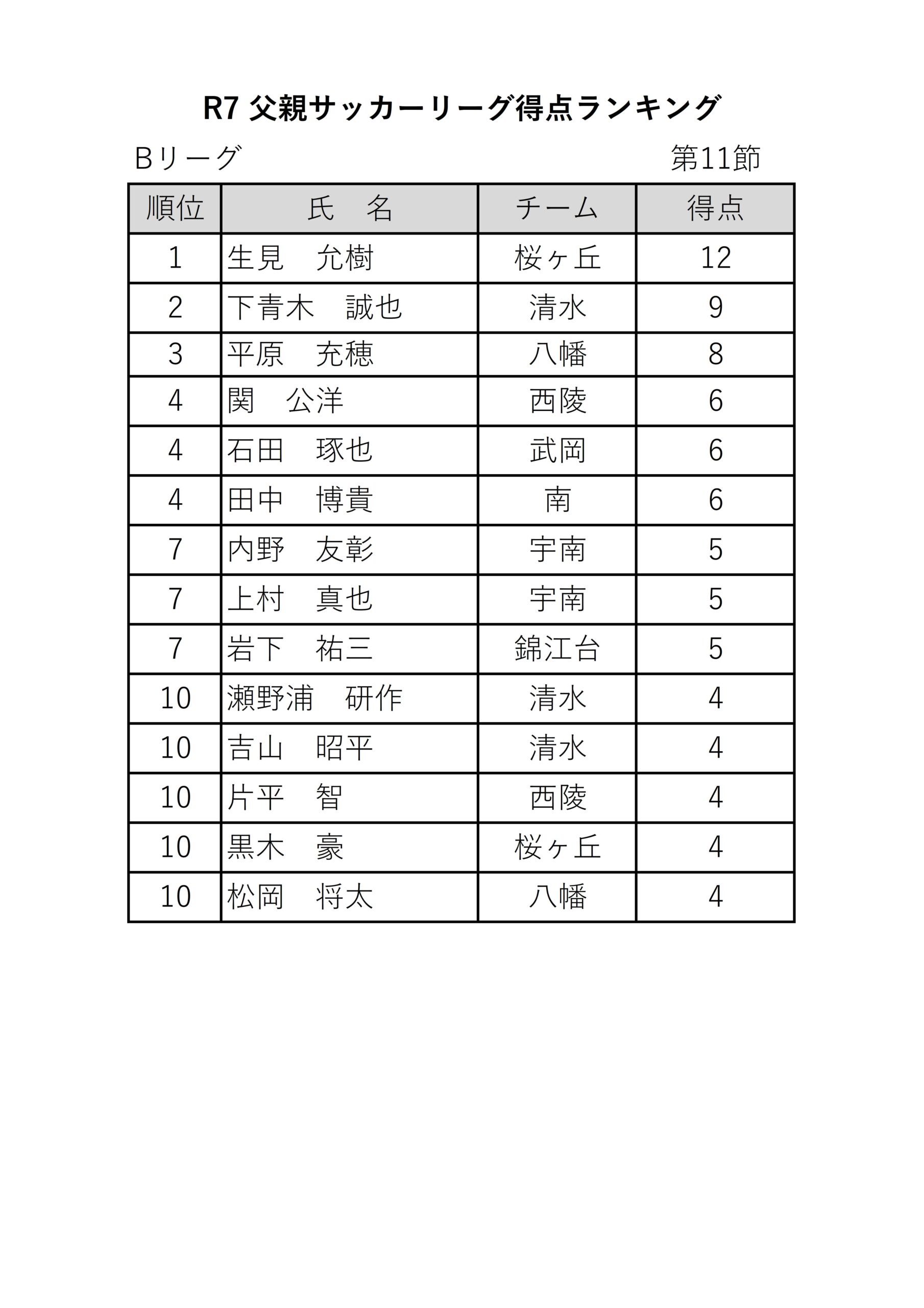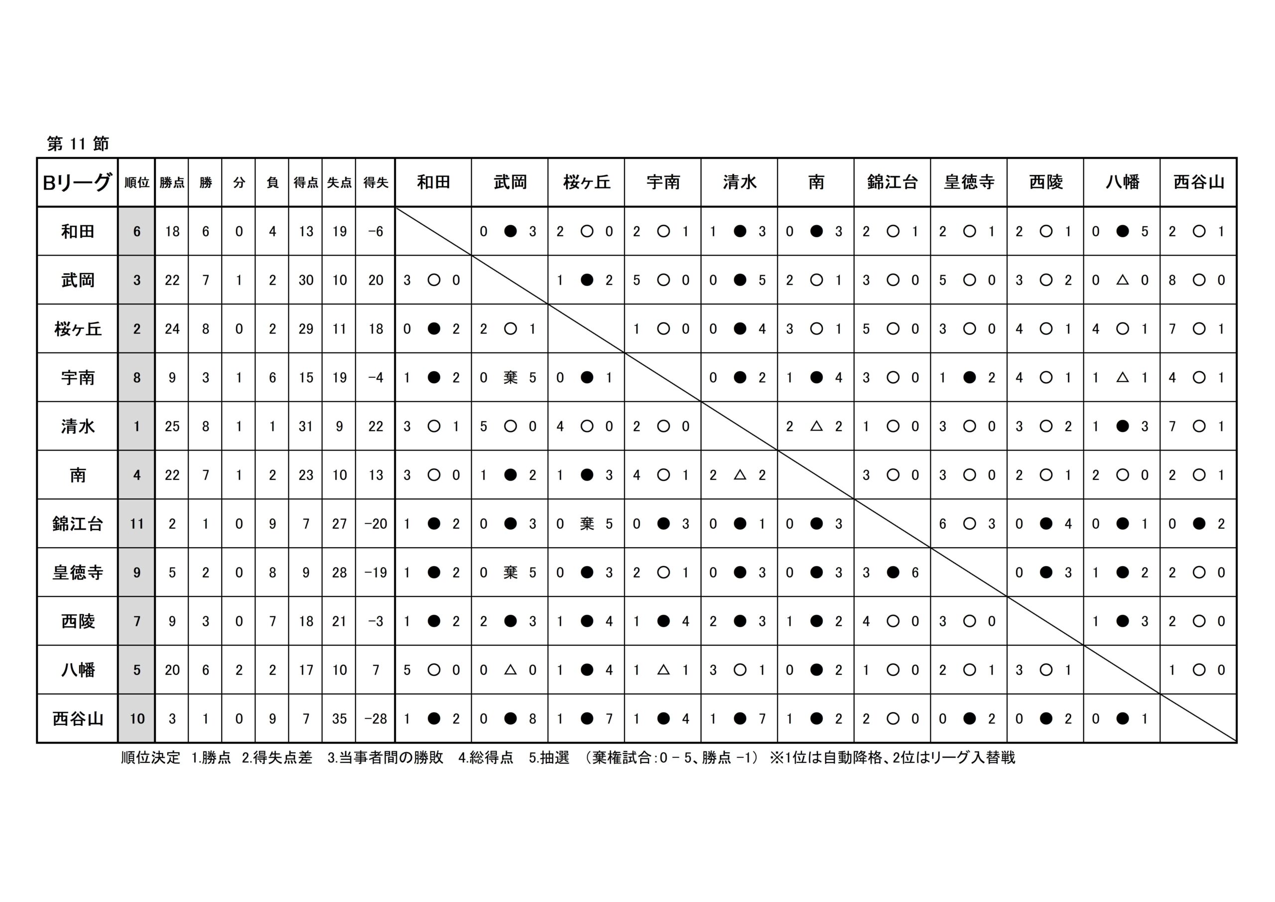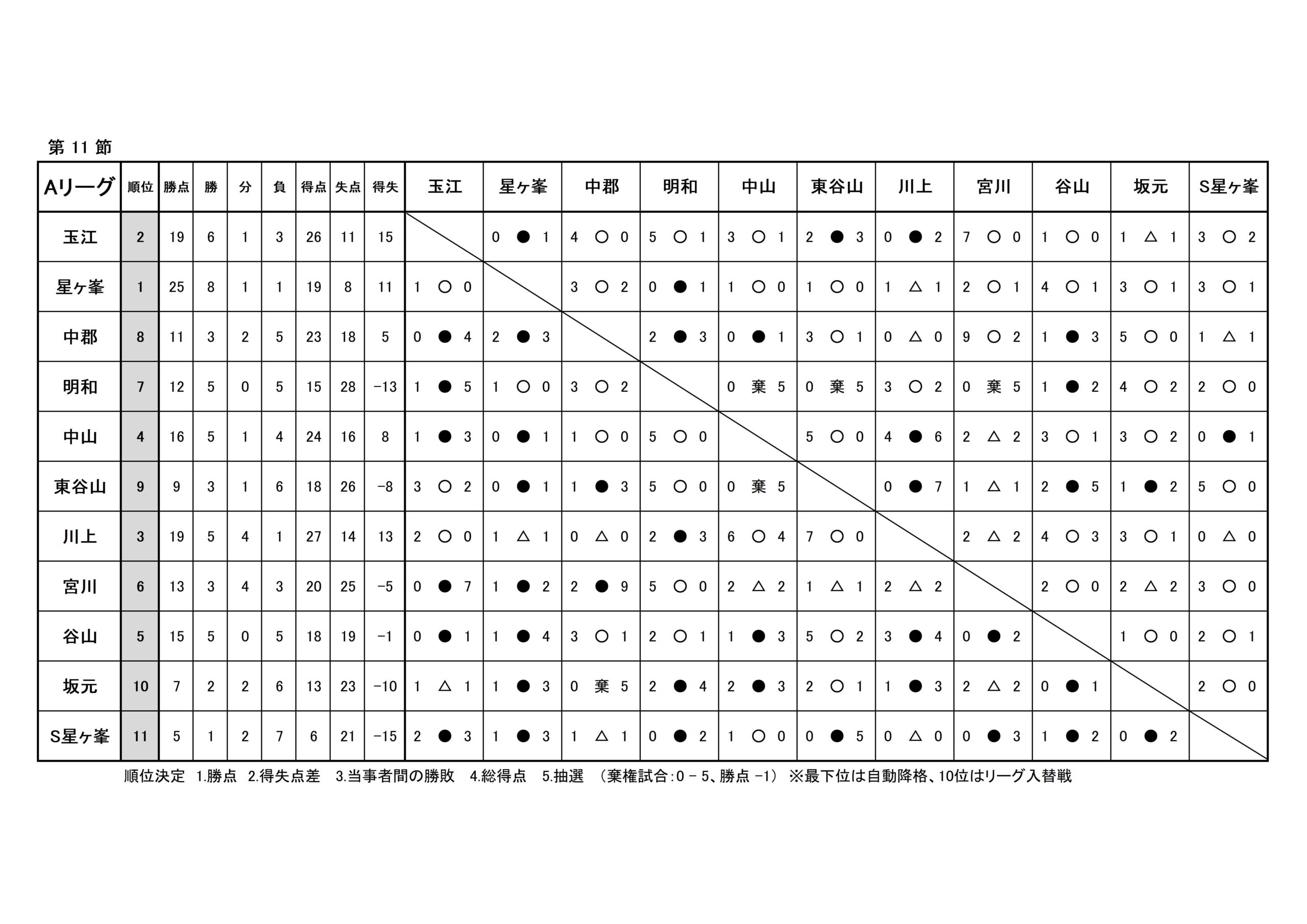 第11節までの星取表及び得点ランキングです。令和7年度リーグ戦の最終結果となります。